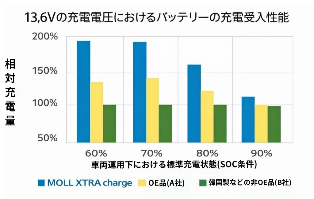XTRA chargeは高い充電受入性能を持つため、充電制御車や回生ブレーキ車のように「短時間で一気に充電する」車両との相性は非常に良好です。
